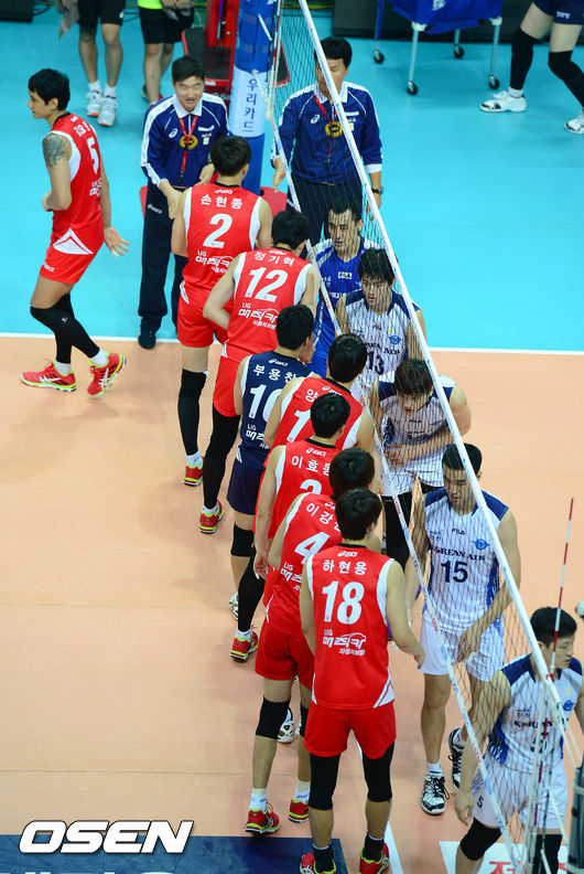 경기종료 후 LIG손해보험과 대한항공 선수들이 악수를 나누고 있다./greenfield@osen.co.kr