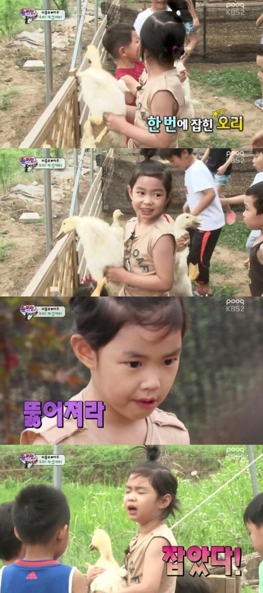 '슈퍼맨'의 타블로의 딸 하루가 용감하게 오리를 잡아 눈길을 끌었다.