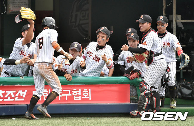 3회말 1사 1,2루에서 진흥고 김기연의 중전 적시타때 홈을 밟은 2루주자 오예준이 더그아웃에서 동료들과 환호하고 있다.