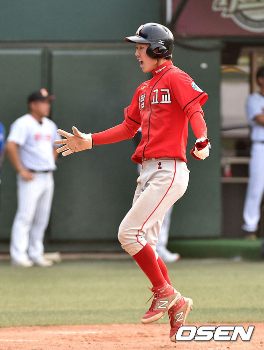8회초 1사 1,2루에서 야탑고 김민호의 동점 2타점 적시타때 홈을 밟은 2루주자 박효준이 환호하고 있다.