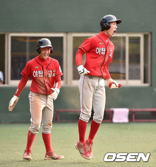 8회초 1사 1,2루에서 야탑고 김민호의 동점 2타점 적시타때 홈을 밟은 2루주자 박효준이 환호하고 있다.