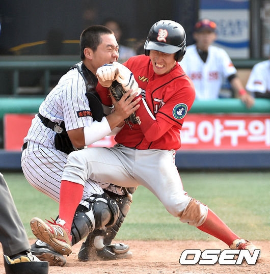 8회초 1사 3루에서 야탑고 최승주의 외야플라이때 홈으로 태그업을 시도한 3루주자 김민호가 아웃되고있다.
