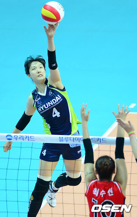 20일 오후 경기도 안산시 상록수체육관에서 진행된 '2014 우리카드컵 프로배구대회'(이하 코보컵) 여자부 B조 현대건설과 KGC인삼공사의 경기, 2세트 현대건설 황연주가 페인트를 시도하고 있다.