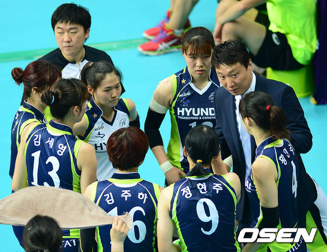 20일 오후 경기도 안산시 상록수체육관에서 진행된 '2014 우리카드컵 프로배구대회'(이하 코보컵) 여자부 B조 현대건설과 KGC인삼공사의 경기, 2세트 현대건설 양철호 감독이 작전지시를 하고 있다.