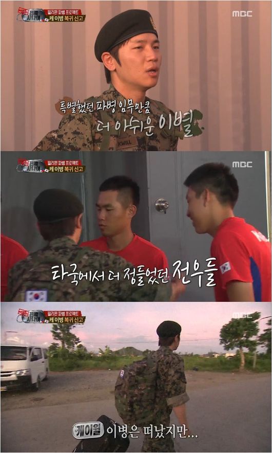케이윌은 20일 방송된 MBC 예능프로그램 ‘일밤-진짜 사나이’에서 다른 멤버들보다 먼저 한국으로 돌아왔다. 그는 다른 일정상 먼저 귀국해야 했다.