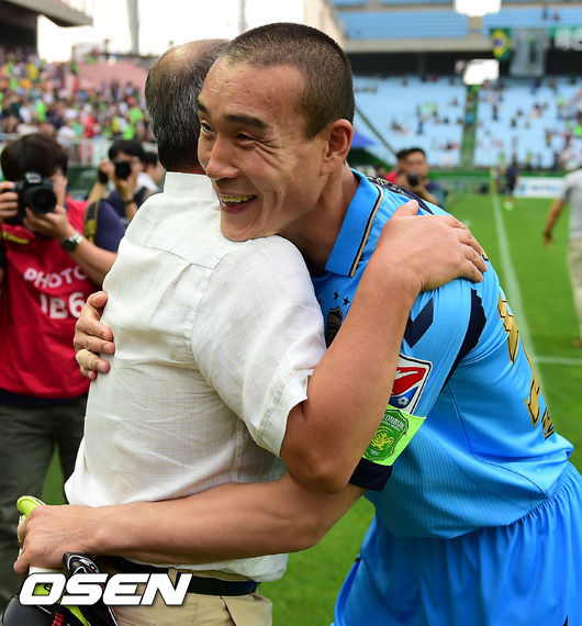20일 오후 전주월드컵경기장에서 열린 전북 현대와 상주 상무의 '현대오일뱅크 K리그 클래식 2014' 16라운드 경기에서 은퇴 경기를 갖는 전북 최은성이 상주의 박항서 감독과 포옹을 하고 있다.
