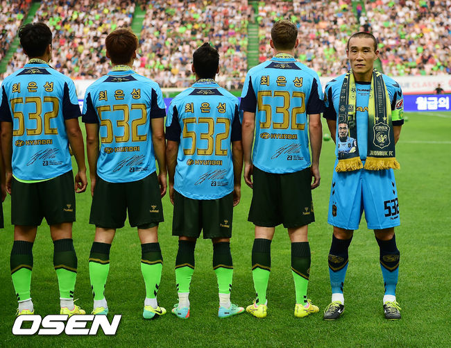 20일 오후 전주월드컵경기장에서 열린 전북 현대와 상주 상무의 '현대오일뱅크 K리그 클래식 2014' 16라운드 경기에서 은퇴 경기를 갖는 최은성(오른쪽)의 유니폼을 전북 선수들이 단체로 착용하고 포토타임을 갖고 있다.