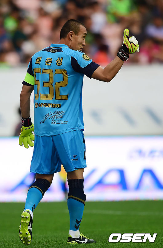 20일 오후 전주월드컵경기장에서 열린 전북 현대와 상주 상무의 '현대오일뱅크 K리그 클래식 2014' 16라운드 경기에서 은퇴 경기를 갖는 최은성이 전반 경기 중 사인을 보내고 있다.