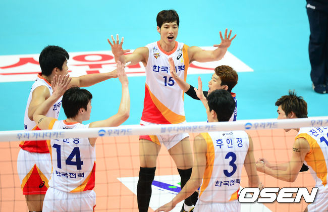 20일 오후 경기도 안산시 상록수체육관에서 진행된 '2014 우리카드컵 프로배구대회'(이하 코보컵) 남자부 B조 한국전력과 OK저축은행의 경기, 1세트 득점에 성공한 한국전력 선수들이 기뻐하고 있다.