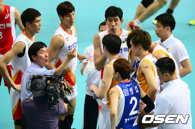20일 오후 경기도 안산시 상록수체육관에서 진행된 '2014 우리카드컵 프로배구대회'(이하 코보컵) 남자부 B조 한국전력과 OK저축은행의 경기, 1세트 한국전력 신영철 감독이 선수들에게 작전을 지시하고 있다.