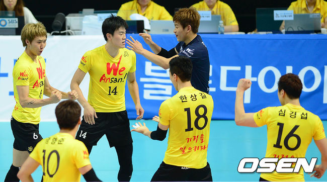 20일 오후 경기도 안산시 상록수체육관에서 진행된 '2014 우리카드컵 프로배구대회'(이하 코보컵) 남자부 B조 한국전력과 OK저축은행의 경기, 1세트 OK저축은행 선수들이 환호하고 있다.