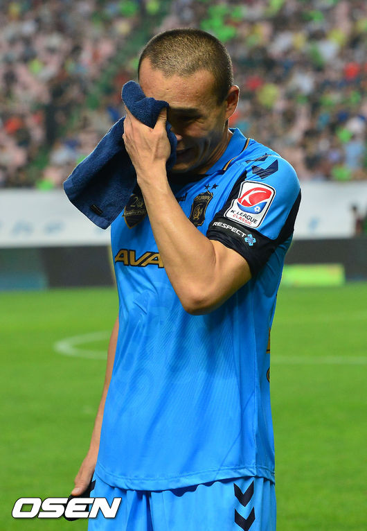 20일 오후 전주월드컵경기장에서 열린 전북 현대와 상주 상무의 '현대오일뱅크 K리그 클래식 2014' 16라운드 경기, 전북 최은성이 은퇴 소감을 말하며 눈물을 흘리고 있다.