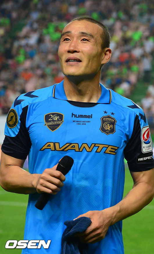 20일 오후 전주월드컵경기장에서 열린 전북 현대와 상주 상무의 '현대오일뱅크 K리그 클래식 2014' 16라운드 경기, 전북 최은성이 은퇴 소감을 말하며 눈물을 흘리고 있다.