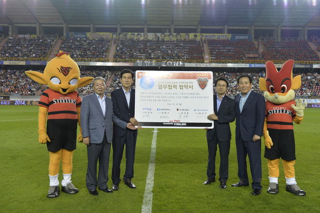 ‘디펜딩 챔피언’ 포항 스틸러스가 20일(일) 부산전서 프로구단 최초로 포항시(이강덕 포항시장), 포항 상공회의소(최병곤 회장), 구룡포 수협(연규식 조합장)과 함께 지역 수산물 판매협약을 체결하고 공동 수산물 브랜드를 출시했다.