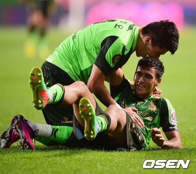 20일 오후 전주월드컵경기장에서 열린 전북 현대와 상주 상무의 '현대오일뱅크 K리그 클래식 2014' 16라운드 경기, 후반 전북 레오나르도가 팀 다섯번째 골을 넣은 후 카이오와 기쁨을 나누고 있다.