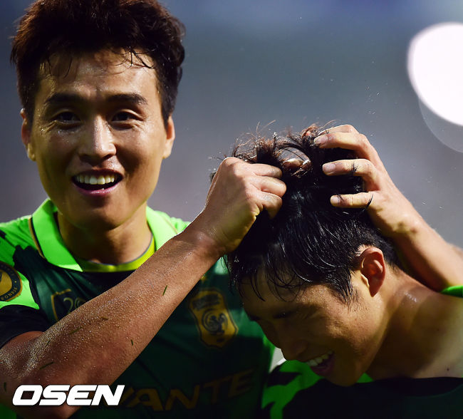 후반 전북 이동국의 도움으로 이승기가 팀 세번째골에 성공했을때 60(득점)-60(도움)을 완성한 이동국이 이승기의 머리를 잡으며 기뻐하고 있다./ rumi@osen.co.kr