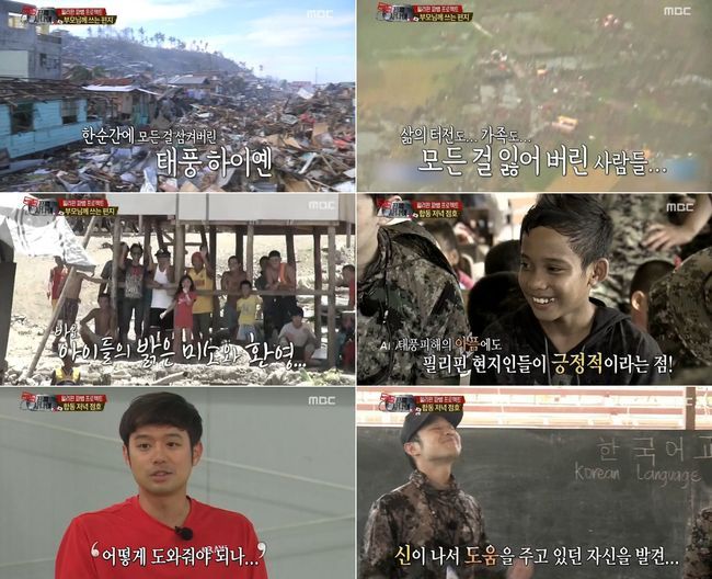[OSEN=조민희 인턴기자] 필리핀 파병을 떠났던 ‘진짜사나이’들이 더 성장했다. 태풍 하이옌으로 큰 피해를 입은 필리핀 주민들을 도와 태풍피해복구현장에 뛰어든 멤버들은 참혹한 현장 앞에 눈물을 감추지 못했다. 멤버들은 그런 상황에서도 웃음을 잃지 않는 아이들을 보며 감동을 받았고, 자신들이 봉사한 것에 대한 뿌듯함을 느꼈다.