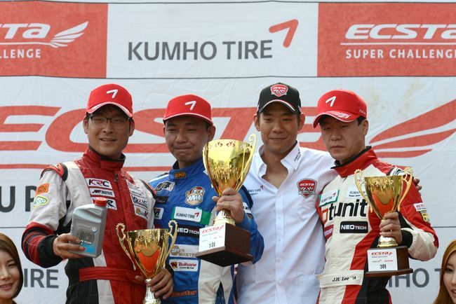 20일 슈퍼챌린지 GT2 클래스에서 우승한 선수들이(왼쪽부터 2위 하종현, 1위 안경식, 김진표, 3위 이재헌) 김진표 드라이버와 함께 기뻐하고 있다. / 슈퍼레이스 제공