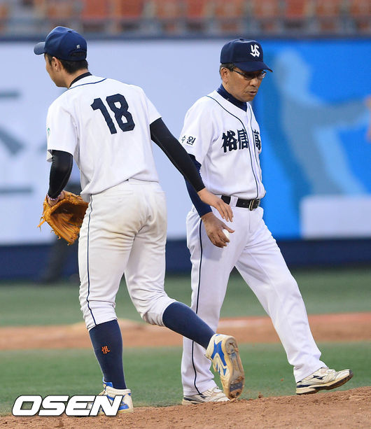 5회초 2사 주자 1루, 유신고 남지훈이 5회 폭투와 볼넷을 기록하고 교체 되어 마운드를 내려 가고 있다.