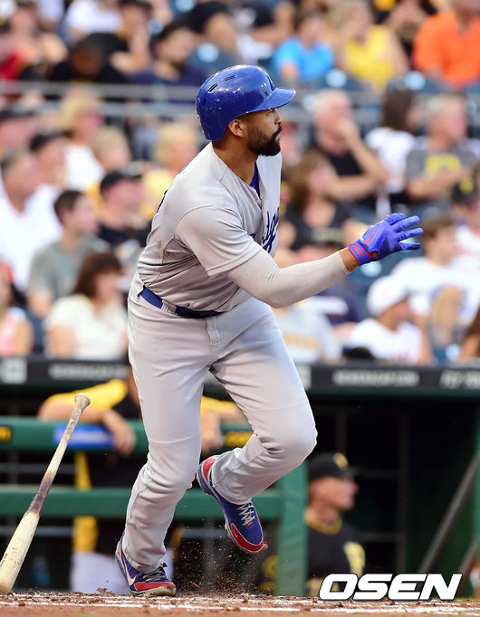 22일(이하 한국시간) 미국 펜실베니아주 피츠버그 PNC파크에서 열리는 피츠버그 파이어리츠와 LA 다저스의 경기, 3회초 1사 1,2루 맷 켐프가 1타점 적시 2루타를 치고 있다.