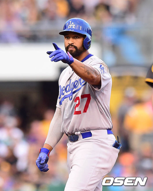 22일(이하 한국시간) 미국 펜실베니아주 피츠버그 PNC파크에서 열리는 피츠버그 파이어리츠와 LA 다저스의 경기, 3회초 1사 1,2루 맷 켐프가 1타점 적시 2루타를 치고 세레모니를 펼치고 있다.