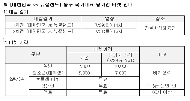 오는 7월 29일(화)과 31일(목) 잠실 학생체육관에서 개최되는 ‘대한민국 vs 뉴질랜드’ 농구 국가대표 평가전 티켓예매를 7월 22일(화) 오전 11시부터 티켓 예매 전문 사이트 인터파크(www.interpark.com)를 통해 시작한다.