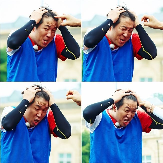 이는 팀 훈련에서 블루팀의 패배로 '딱밤 단두대'에 오른 정형돈의 모습으로, 레드팀 전원으로부터 동료들의 딱밤까지 모조리 맞는 수모를 겪게 된 것.