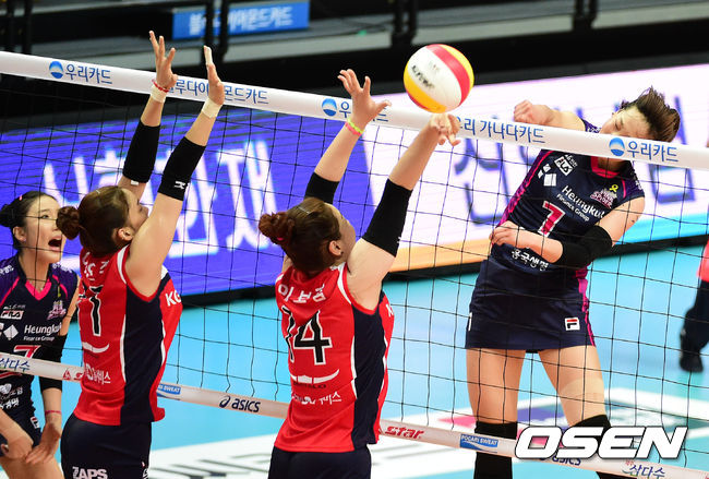 1세트 흥국생명 정시영이 인삼공사 이연주, 이보람의 블로킹을 피해 강타를 날리고 있다.