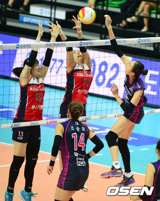 3세트 흥국생명 김혜진이 인삼공사 유미라, 이연주의 블로킹을 피해 강타를 성공시키며 승리를 결정짓고 있다./ jpnews@osen.co.kr