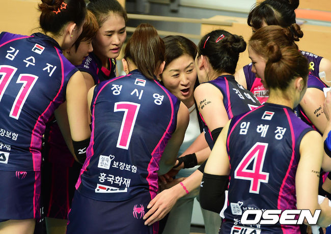 1세트 흥국생명 박미희 감독이 작전타임을 하며 파이팅을 외치고 있다./ jpnews@osen.co.kr