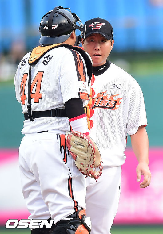 22일 오후 대전 한밭야구장에서 열린 '2014 한국야쿠르트 세븐 프로야구' 한화 이글스와 NC 다이노스의 경기, 1회초 1사 주자 3루 NC 나성범에게 볼넷을 내준 한화 선발 송창현이 조인성과 얘기를 나누고 있다.