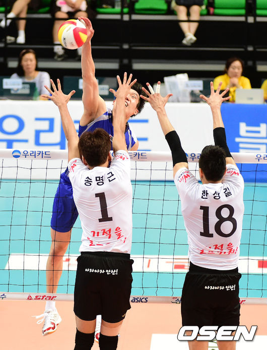 1세트 대한항공 신영수가 OK저축은행 송명근, 한상길을 블로킹을 피해 강타를 날리고 있다.
