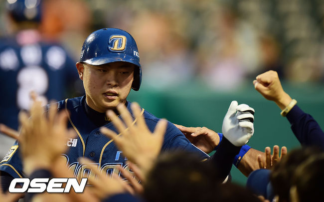 22일 오후 대전 한밭야구장에서 열린 '2014 한국야쿠르트 세븐 프로야구' 한화 이글스와 NC 다이노스의 경기, 4회초 1사 주자 없는 상황에서 NC 권희동이 좌월 솔로 홈런을 날린 후 덕아웃에서 동료들과 하이파이브를 하고 있다.