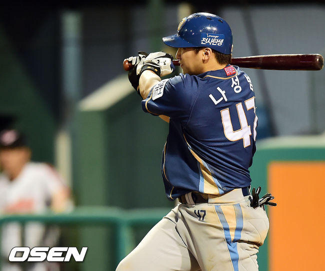22일 오후 대전 한밭야구장에서 열린 '2014 한국야쿠르트 세븐 프로야구' 한화 이글스와 NC 다이노스의 경기, 4회초 2사 주자 2루 NC 나성범이 우익수 오른쪽 1타점 적시타를 날리고 있다.