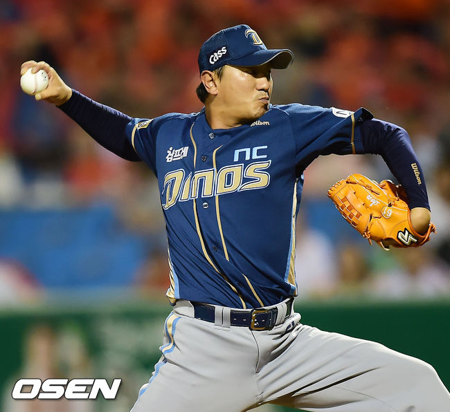 22일 오후 대전 한밭야구장에서 열린 '2014 한국야쿠르트 세븐 프로야구' 한화 이글스와 NC 다이노스의 경기, 6회말 마운드에 오른 NC 손민한이 힘차게 공을 뿌리고 있다.