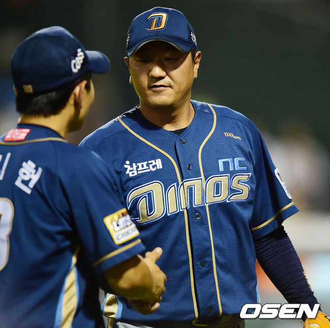 22일 오후 대전 한밭야구장에서 열린 '2014 한국야쿠르트 세븐 프로야구' 한화 이글스와 NC 다이노스의 경기, 6회말을 막아낸 NC 손민한이 덕아웃으로 향하며 손시헌과 악수를 나누고 있다.