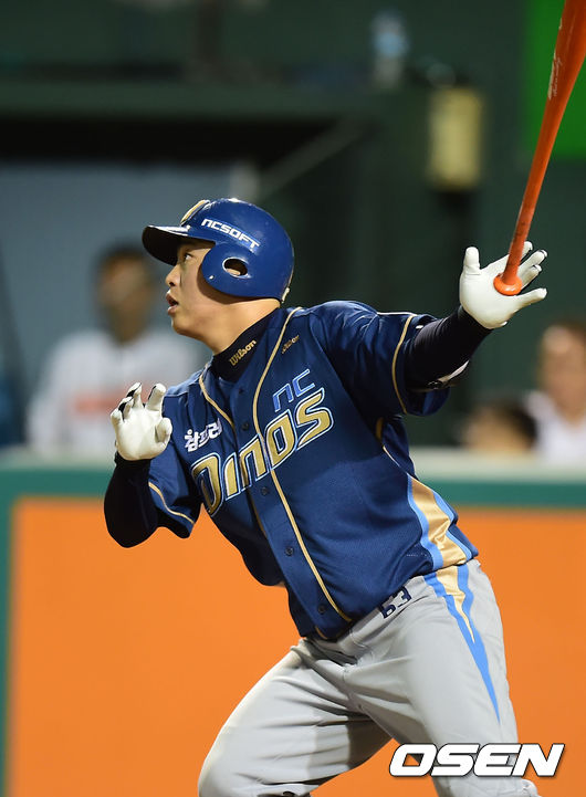 22일 오후 대전 한밭야구장에서 열린 '2014 한국야쿠르트 세븐 프로야구' 한화 이글스와 NC 다이노스의 경기, 7회초 1사 주자 1루 NC 권희동이 우익수 왼쪽 안타를 날리고 있다.