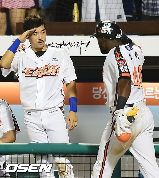 22일 오후 대전 한밭야구장에서 열린 '2014 한국야쿠르트 세븐 프로야구' 한화 이글스와 NC 다이노스의 경기, 7회말 1사 주자 2루 한화 피에가 역전 우월 투런 홈런을 날린 후 덕아웃에서 이용규와 거수 경례 세레모니를 펼치고 있다.