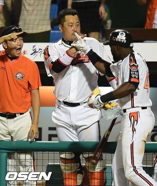 22일 오후 대전 한밭야구장에서 열린 '2014 한국야쿠르트 세븐 프로야구' 한화 이글스와 NC 다이노스의 경기, 7회말 1사 주자 2루 한화 피에가 역전 우월 투런 홈런을 날린 후 덕아웃에서 조인성과 세레모니를 펼치고 있다.
