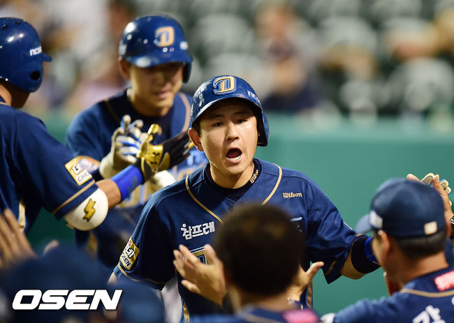 22일 오후 대전 한밭야구장에서 열린 '2014 한국야쿠르트 세븐 프로야구' 한화 이글스와 NC 다이노스의 경기, 8회말 2사 주자 만루 NC 조영훈의 우익수 오른쪽 2타점 적시타때 홈을 밟은 손시헌과 최재원이 덕아웃에서 동료들과 기쁨을 나누고 있다.