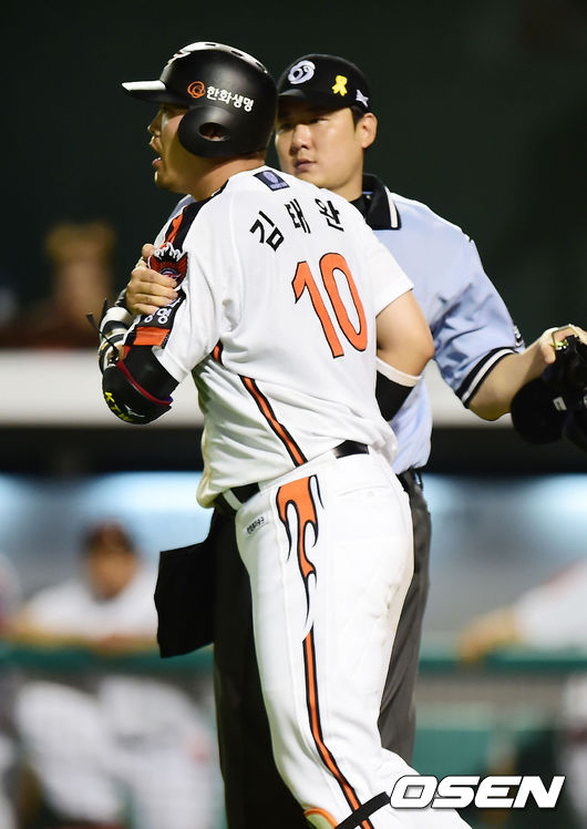 22일 오후 대전 한밭야구장에서 열린 '2014 한국야쿠르트 세븐 프로야구' 한화 이글스와 NC 다이노스의 경기, 8회말 1사 주자 1,2루 한화 김태완이 NC 김진성의 투구에 몸에 볼을 맞으며 김정국 구심을 밀치며 화를 내고 있다. 이어서 벤치클리어링이 진행됐다.