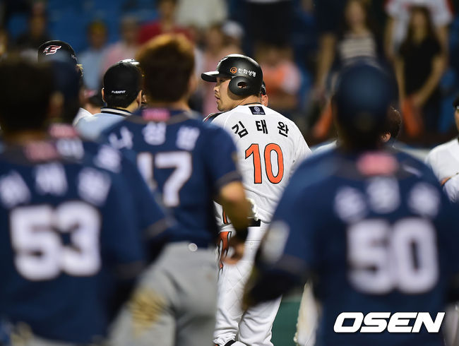 22일 오후 대전 한밭야구장에서 열린 '2014 한국야쿠르트 세븐 프로야구' 한화 이글스와 NC 다이노스의 경기, 8회말 1사 주자 1,2루 한화 김태완이 NC 김진성의 투구에 몸에 볼을 맞으며 김정국 구심을 밀치며 화를 내고 있다. 이어서 벤치클리어링이 진행되고 있다.