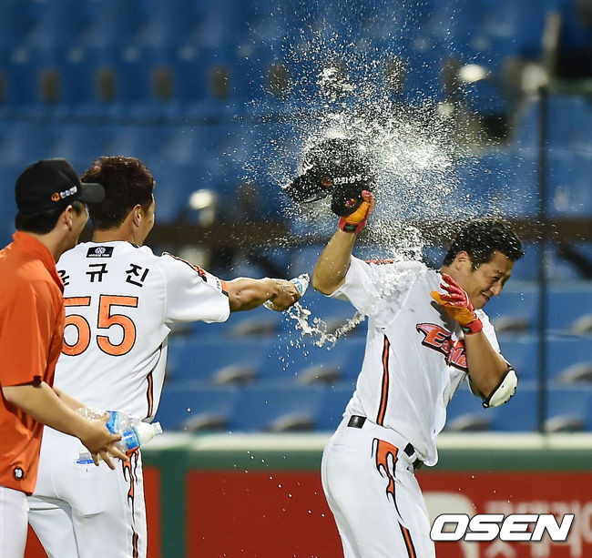 경기를 마치고 밀어내기 볼넷의 정현석이 끝내기 물세례를 받고 있다. / rumi@osen.co.kr