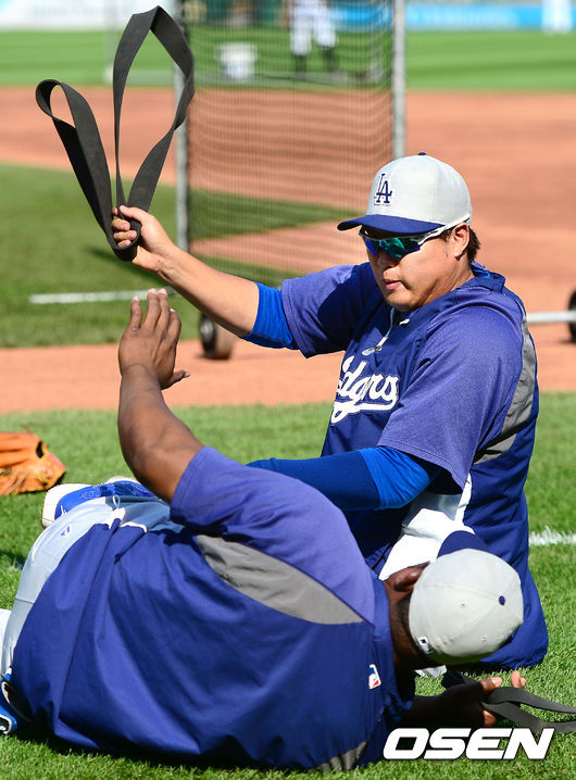 23일(이하 한국시간) 미국 펜실베니아주 피츠버그 PNC파크에서 열리는 피츠버그 파이어리츠와 LA 다저스의 경기에 앞서 다저스 류현진과 유리베가 장난을 치고 있다.