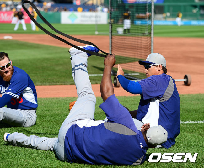 23일(이하 한국시간) 미국 펜실베니아주 피츠버그 PNC파크에서 열리는 피츠버그 파이어리츠와 LA 다저스의 경기에 앞서 다저스 류현진과 유리베가 장난을 치고 있다.