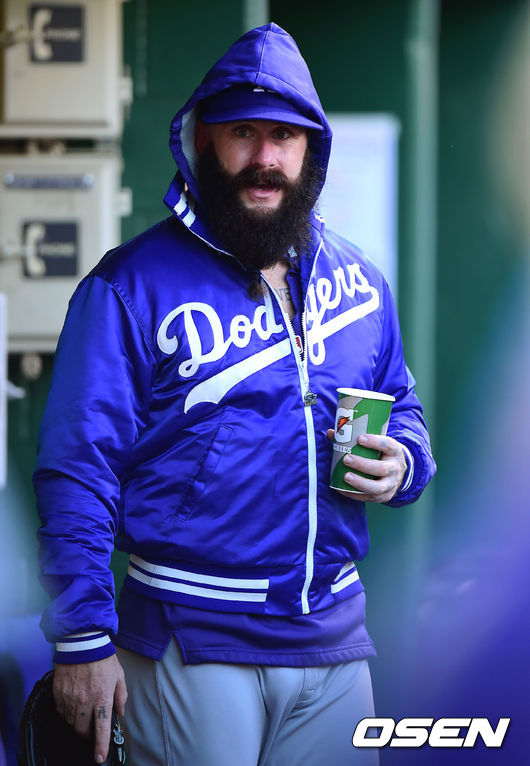 다저스 윌슨이 다저스 유광 점퍼를 입고 더그아웃에서 동료들과 이야기를 나누고 있다.