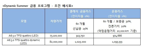 A6 3.0 TFSI quttro(가격 7,310만원) 모델을 이번 특별 금융 프로그램을 통해 구매하면 계약 시 선납금 25%(1,828만원)를 내고 60개월 동안 이자 없이 월 92만원을 납입하면 된다. 계약 만기시에는 등록비용을 내고 차량을 완전히 소유할 수 있다.