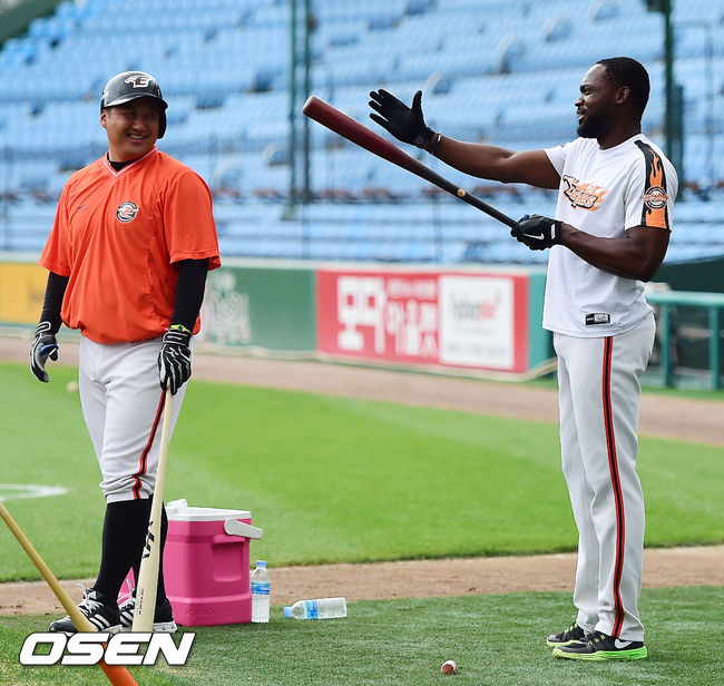 23일 오후 대전 한밭야구장에서 '2014 한국야쿠르트 세븐 프로야구' 한화 이글스와 NC 다이노스의 경기가 열릴 예정인 가운데 양팀 훈련 시간에 한화 조인성이 피에와 얘기를 하고 있다.