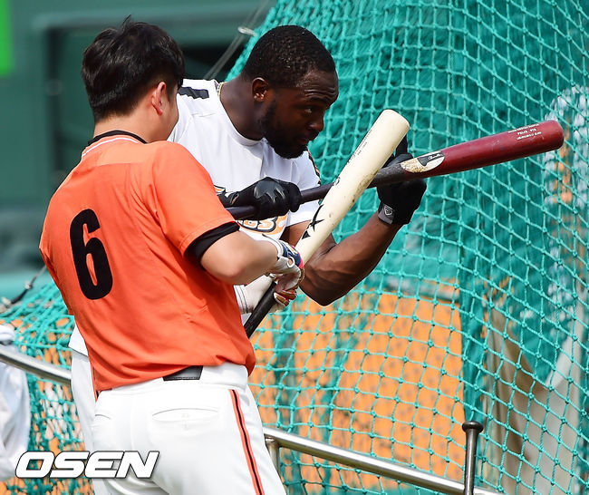 23일 오후 대전 한밭야구장에서 '2014 한국야쿠르트 세븐 프로야구' 한화 이글스와 NC 다이노스의 경기가 열릴 예정인 가운데 양팀 훈련 시간에 한화 피에가 이창열에게 번트 비법을 알려주고 있다.