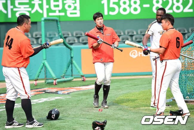 23일 오후 대전 한밭야구장에서 '2014 한국야쿠르트 세븐 프로야구' 한화 이글스와 NC 다이노스의 경기가 열릴 예정인 가운데 양팀 훈련 시간에 한화 이창열(오른쪽)이 피에에게 번트 비법을 배운 후 조인성에게 물어보고 있다.